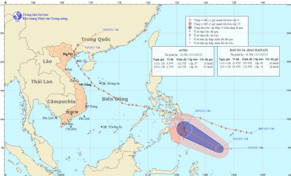 Trung tâm Dự báo khí tượng thủy văn Trung ương cho biết: Hiện nay, một áp thấp nhiệt đới đang hoạt động trên khu vực vùng biển ngoài khơi phía Đông Nam Philippin. Hồi 13 giờ ngày 11/11, vị trí tâm áp thấp nhiệt đới ở vào khoảng 4,8 độ Vĩ Bắc; 132,5 độ Kinh Đông, cách đảo Min - Đa - Nao (Philippin) khoảng 760km về phía Đông Đông Nam. Sức gió mạnh nhất ở vùng gần tâm áp thấp nhiệt đới mạnh cấp 6, cấp 7 (tức là từ 39 đến 61 km một giờ), giật cấp 8, cấp 9. Dự báo trong 24 giờ tới, áp thấp nhiệt đới di chuyển theo hướng giữa Tây Tây Bắc và Tây Bắc, mỗi giờ đi được khoảng 25 - 30km và có khả năng mạnh lên thành bão. Đến 13 giờ ngày 12/11, vị trí tâm bão ở vào khoảng 8,3 độ Vĩ Bắc; 126,3 độ Kinh Đông, trên khu vực phía Đông đảo Min - Đa - Nao (Philippin). Sức gió mạnh nhất ở vùng gần tâm bão mạnh cấp 8 (tức là từ 62 đến 74 km một giờ), giật cấp 9, cấp 10.