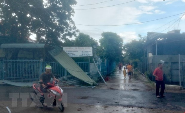 Nhiều nhà dân bị gió tốc mái hư hỏng. (Ảnh: TTXVN phát)