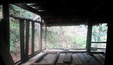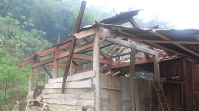 Một căn nhà sàn khá chắc chắn nhưng cũng bị gió giật tung các tấm gỗ được đóng khung.