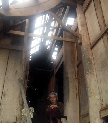 Một cụ già ngồi co ro trong ngồi nhà bị lốc "xé nát" ngói lợp.