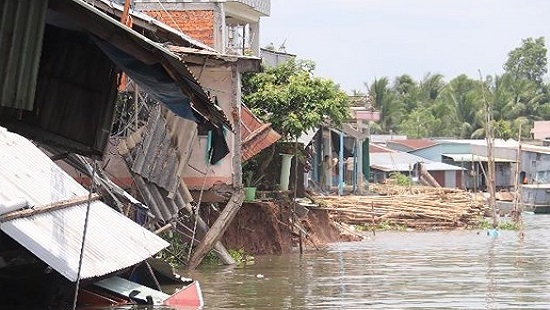 Khu vực sạt lở dài hàng chục mét, sâu vào bờ 5m. Trong số 11 căn nhà bị ảnh hưởng có nhiều căn bị sụp đổ hoàn toàn, một trụ điện bị rơi xuống sông.