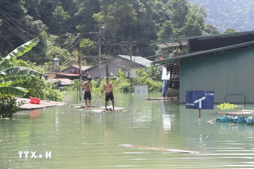 Người dân ở xã Quang Vinh, huyện Trùng Khánh (Cao Bằng) dùng bè để di chuyển do ngập sâu, ảnh chụp ngày 27/8. (Ảnh: Chu Hiệu/TTXVN)