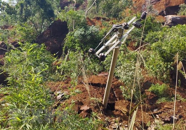 Vụ sạt lở khiến cột điện bị đổ, đường dây trung thế bị đứt. (Ảnh: CTV/TTXVN phát)
