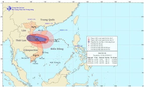 Dự báo trong 12 giờ tới, bão di chuyển theo hướng giữa Tây và Tây Tây Bắc, mỗi giờ đi được khoảng 20km. Đến 16 giờ ngày 30/9, vị trí tâm bão ở vào khoảng 17,3 độ Vĩ Bắc; 106,7 độ Kinh Đông, trên đất liền các tỉnh Hà Tĩnh - Quảng Trị. Sức gió mạnh nhất ở vùng gần tâm bão mạnh cấp 9, cấp 10 (từ 75 đến 102 km/giờ), giật cấp 11, cấp 12.