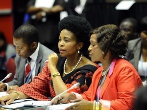 Ngoại trưởng Nam Phi, Chủ tịch COP 17 Maite Nkoana-Mashabane (giữa) tại phiên thảo luận cuối cùng của Hội nghị. (Nguồn: AFP/TTXVN)
