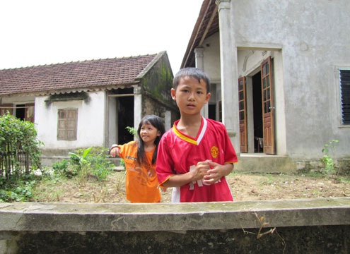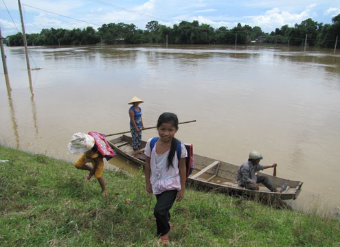 Các em bé xóm ốc đảo muốn đến trường phải vượt qua dòng nước lũ.