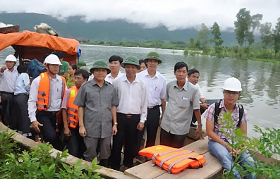 | Đồng chí Hoàng Văn Hoằng, Phó Bí thư Thường trực Tỉnh ủy, kiểm tra tình hình ngập nước vùng lòng hồ Yên Mỹ (Tĩnh Gia). |