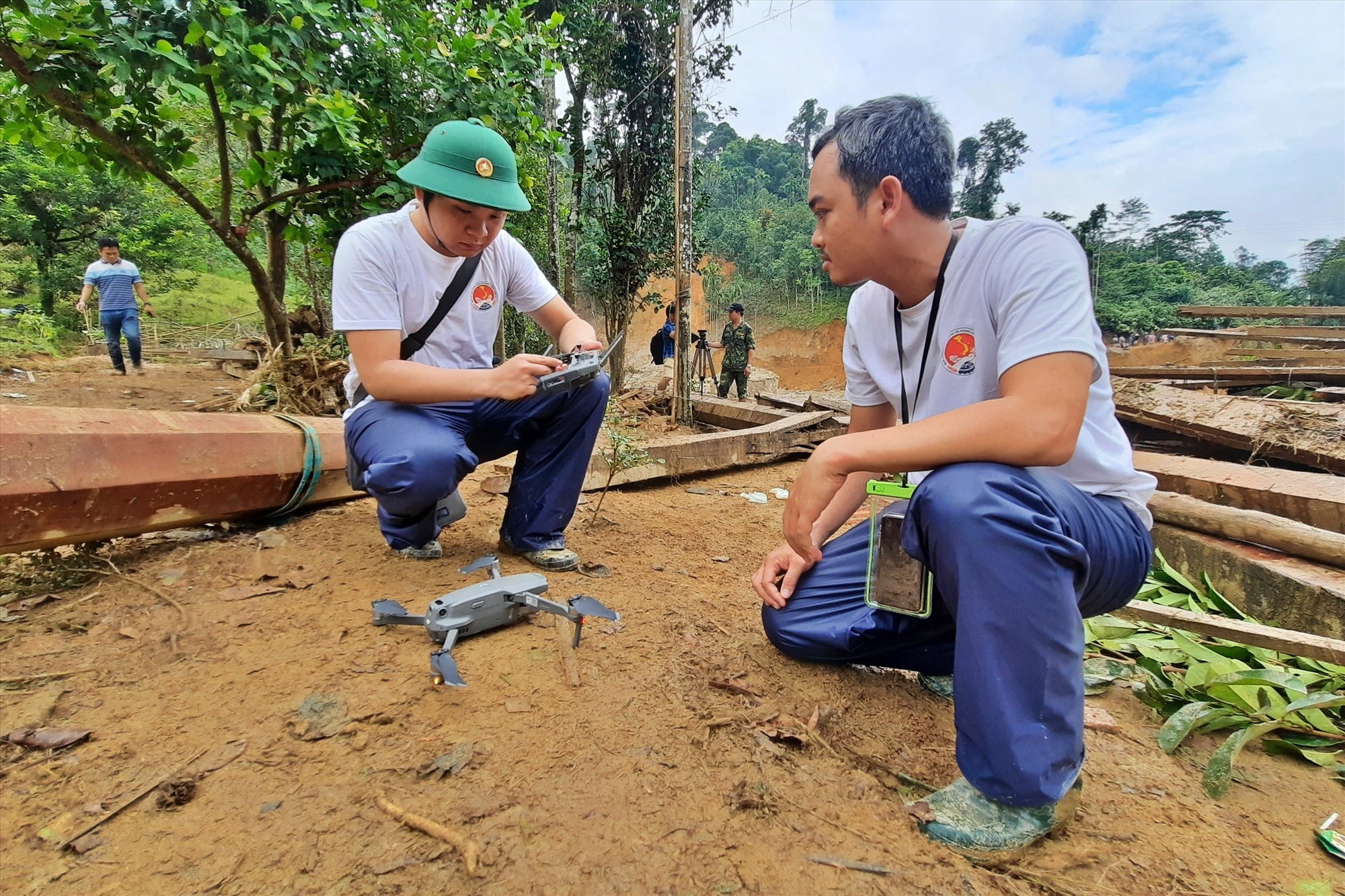 Tổ cán bộ của Văn phòng Thường trực Ban chỉ đạo Trung ương về phòng chống thiên tai gồm 2 cán bộ kỹ thuật và mang theo 2 flycam vào thôn 1 (Trà Leng). Ảnh: NHÓM PV Flycam hỗ trợ tìm kiếm nạn nhân mất tích triển khai trong 2 ngày qua. Ảnh: NHÓM PV ...bay dọc các suối tìm kiếm nạn nhân. Ảnh: NHÓM PV Ngoài nhiệm vụ tìm kiếm người mất tích, flycam còn để xác định các vị trí sạt lở phục vụ các lực lượng cứu nạn thông đường vào thôn 1. Ảnh: NHÓM PV Flycam sẽ bay tầm cao với bán kính 2.000m ở khu vực sạt lở, các suối tìm kiếm nạn nhân còn mất tích có thể trôi xuống suối. Ảnh: NHÓM PV Căng mắt kiểm tra từng vị trí trên màn hình để tìm nạn nhân. Ảnh: NHÓM PV Thiếu tướng Hứa Văn Tưởng (bên phải) - Phó Tư lệnh Quân khu 5 theo dõi cuộc tìm kiếm bằng flycam. Ảnh: NHÓM PV