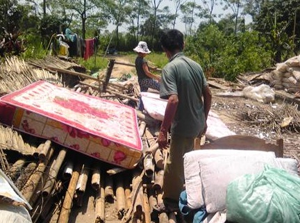 Vào khoảng 22h đêm 20/5, trận mưa lớn kèm theo lốc xoáy đã thổi bay hàng chục nóc nhà dân ở phường Trần Phú, quận Hoàng Mai, Hà Nội. “Đang ngồi trong nhà tránh mưa, bỗng tôi thấy mái nhà đập lên, đập xuống đùng đùng. Vài giây sau những tấm tôn bay tung lên trời. Rất may phía dưới mái vẫn còn lớp gỗ nên cả nhà không ai bị thương”, anh Khôi ở tổ 11 phường Trần Phú cho biết.