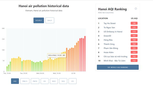 Đến thời điểm 9 giờ sáng, Hà Nội ở vị trí thứ 8 trong top danh sách “10 thành phố ô nhiễm nhất thế giới,” nhưng chỉ số AQI ở hầu hết các điểm quan trắc vẫn tiếp tục hiện thị ngưỡng “màu đỏ” với chỉ số AQI cao nhất lên đến 195 tại khu vực Tây Hồ; Hàng Đậu 164; Thành Công 164; Hoàn Kiếm 153…