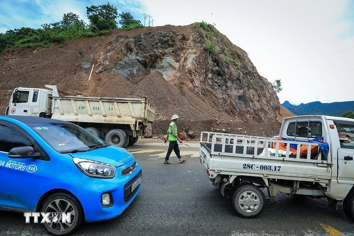 Các phương tiện giao thông đã có thể di chuyển chậm qua điểm sạt lở tại dốc Cun, lý trình Km79+335, Quốc lộ 6, thuộc địa phận phường Thống Nhất, thành phố Hòa Bình.