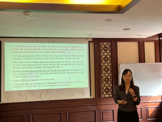 Bà Đỗ Thị Hồng Nhung - Phó Trưởng phòng phụ trách phòng Đào tạo và bồi dưỡng nghiệp vụ, Trung tâm Chính sách và Kỹ thuật PCTT - thay mặt cơ quan chủ trì biên soạn tài liệu trình bày quá trình triển khai; tổng hợp những góp ý qua các đợt tham vấn và nội dung tài liệu hướng dẫn đã được tiếp thu.