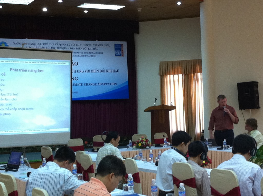7. Liên hệ giữa Giảm nhẹ rủi ro thiên tai và thích ứng biến đổi khí hậu được trình bày bởi ông Terry Cannon, Giám đốc Chương trình tăng cường năng lực thích ứng biến đổi khí hậu, Viện Phát triển, Vương quốc Anh.