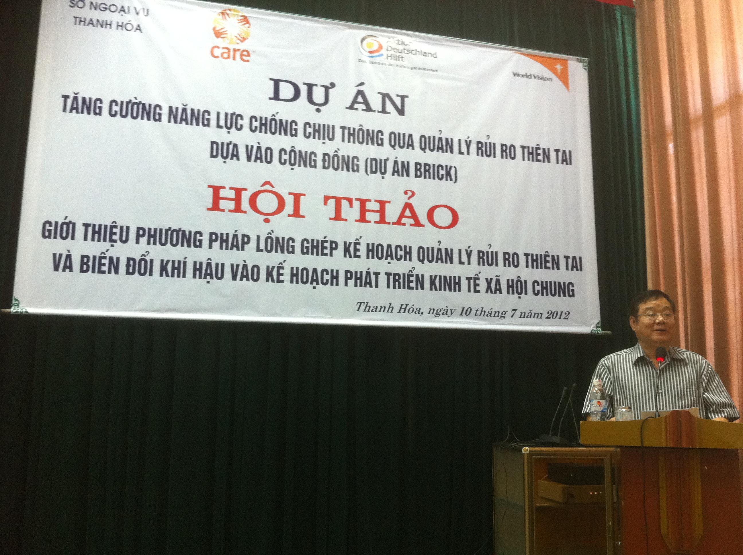 Một trong những hoạt động quan trọng của Dự án là hướng dẫn lồng ghép Kế hoạch phòng chống và giảm nhẹ thiên tai, thích ứng biến đổi khí hậu vào Kế hoạch phát triển kinh tế xã hội. Để triển khai hoạt động này, ngày 10/7/2012, Sở Ngoại vụ Thanh Hóa, đơn vị quản lý dự án, phối hợp với tổ chức CARE và Tầm nhìn thế giới đã tổ chức Hội thảo Hướng dẫn lồng ghép Kế hoạch phòng chống và giảm nhẹ thiên tai, thích ứng biến đổi khí hậu vào Kế hoạch phát triển kinh tế xã hội tại Thanh Hóa.