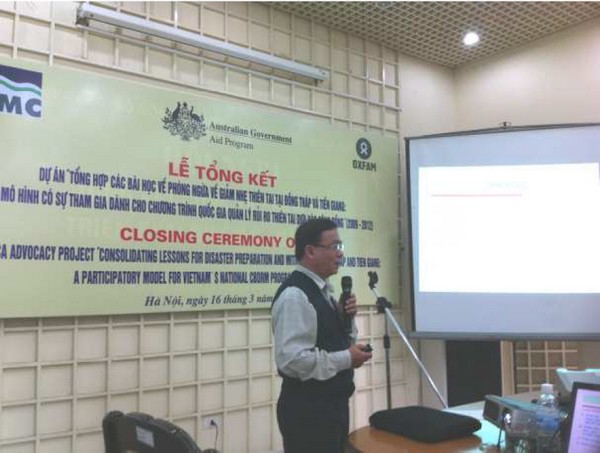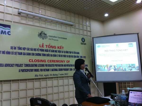 Để đánh giá những kết quả của dự án trong việc hỗ trợ Đề án Nâng cao nhận thức cộng đồng và quản lý rủi ro thiên tai dựa vào cộng đồng của Chính phủ, ngày 16/3/2012, Bộ Nông nghiệp và Phát triển nông thôn (Trung tâm Phòng tránh và Giảm nhẹ thiên tai) phối hợp với Tổ chức Oxfam Anh tổ chức Hội thảo tổng kết Dự án với sự chủ trì của ông Nguyễn Xuân Diệu, Phó Tổng cục trưởng Tổng cục Thủy lợi, Bộ Nông nghiệp và Phát triển nông thôn. Tham gia Hội thảo có bà Kathryn Elliott, Bí thư thứ nhất – Đại sứ quán Úc; Bà Kathryn Beckett, Bí thư thứ nhất – Đại sứ quán New Zealand; Bà Lê Kim Dung, Trưởng đại diện Tổ chức Oxfam Anh tậi Việt Nam; ông Nguyễn Hữu Phúc, Giám đốc Trung tâm Phòng tránh và Giảm nhẹ thiên tai; đại diện Bộ Kế hoạch và Đầu Tư, Bộ Tài nguyên và Môi trường; Lãnh đạo Ban Chỉ huy PCLB và TKCN các tỉnh Bến Tre, Tiền Giang, Đồng Tháp, Ninh Thuận, Trà Vinh, Kiên Giang.
