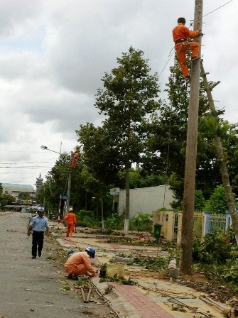 Chiều ngày 5/9, tại khu vực thị trấn Mỹ An, trên những tuyến đường chính, công nhân vệ sinh khẩn trương cắt tỉa cành, thân cây; nhân viên điện lực sửa chữa hệ thống điện bị hư hỏng.