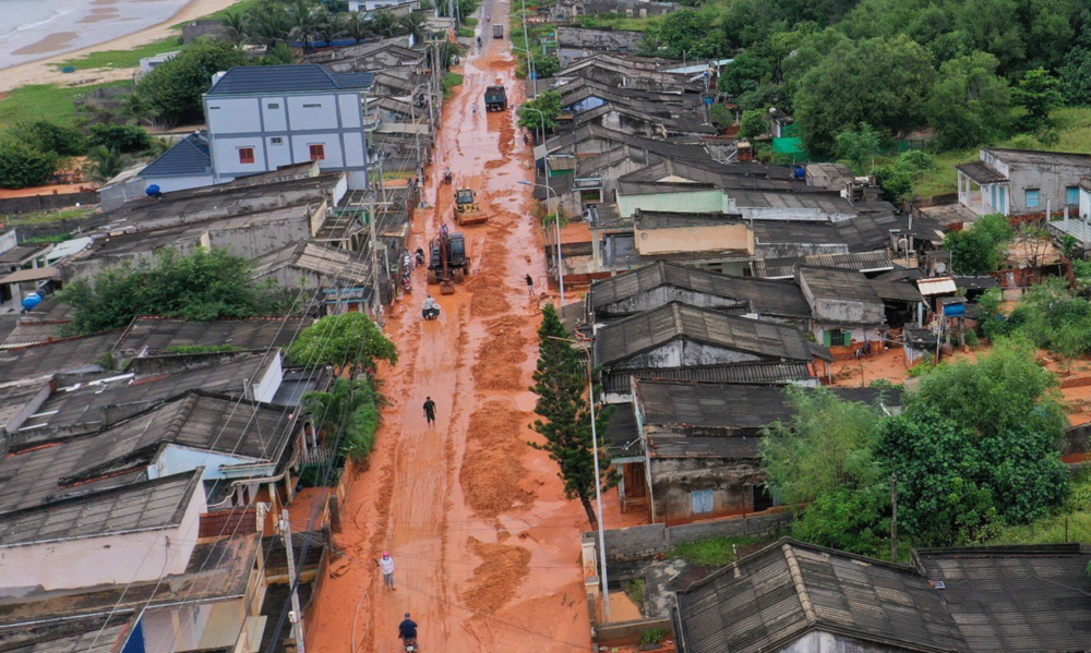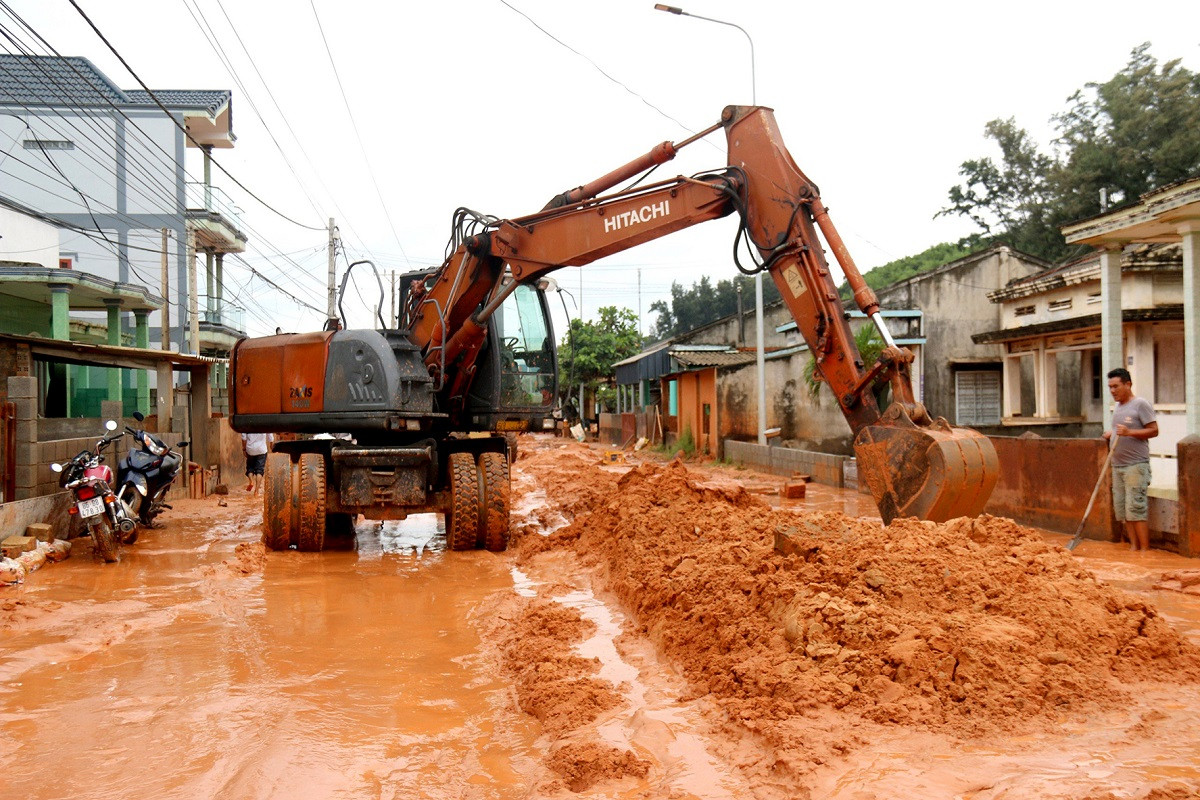 Chiều 1/10, sau trận mưa lớn, nước lũ làm cát đỏ trên đồi tràn xuống khu dân cư và tuyến đường ĐT 719 ven biển xã Tiến Thành gây ách tắc giao thông.