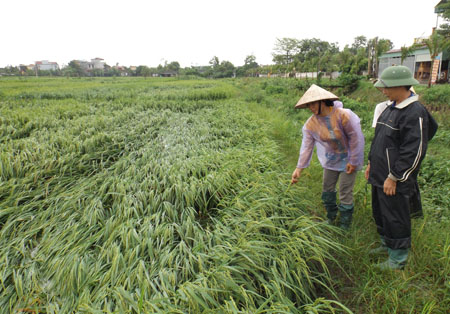 | Nông dân thôn Mỹ Giá, xã Quỳnh Hưng (Quỳnh Phụ) thăm lúa sau bão số 3. |