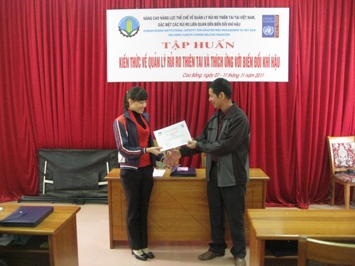 - Cuối khoá tập huấn các học viên được Ban quản lý dự án SCDM và Ban chỉ huy phòng chống lụt bão tỉnh Cao Bằng cấp Giấy chứng nhận đã tham dự lớp tập huấn về Quản lý rủi ro thiên tai và Thích ứng với Biến đổi khí hậu