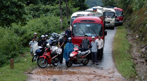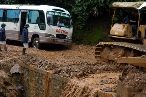 | Xe ủi kéo xe khách vượt qua vũng lầy và khu vực sạt lở để giải tỏa ách tắc |