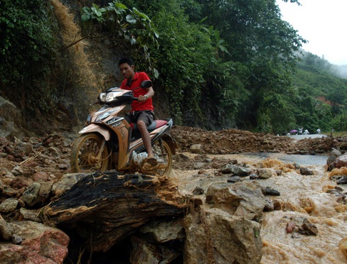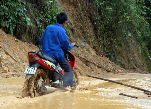 | Người dân địa phương vượt qua khu vực sạt lở do trận mưa gây ra |