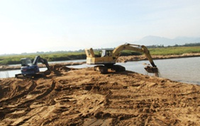 | Huy động máy móc khơi lạch ven sông Ba (Phú Yên) dẫn nước vào các trạm bơm. Ảnh: VGP/Thế Phong |