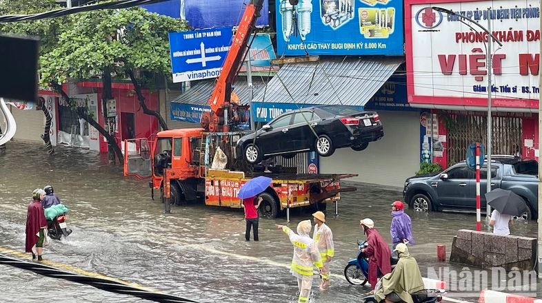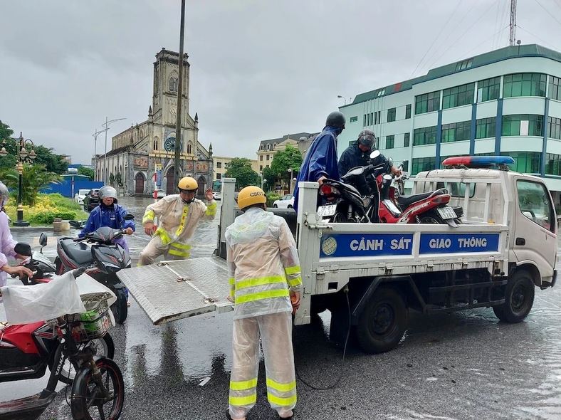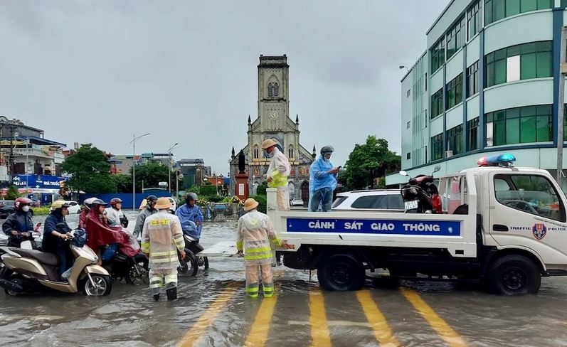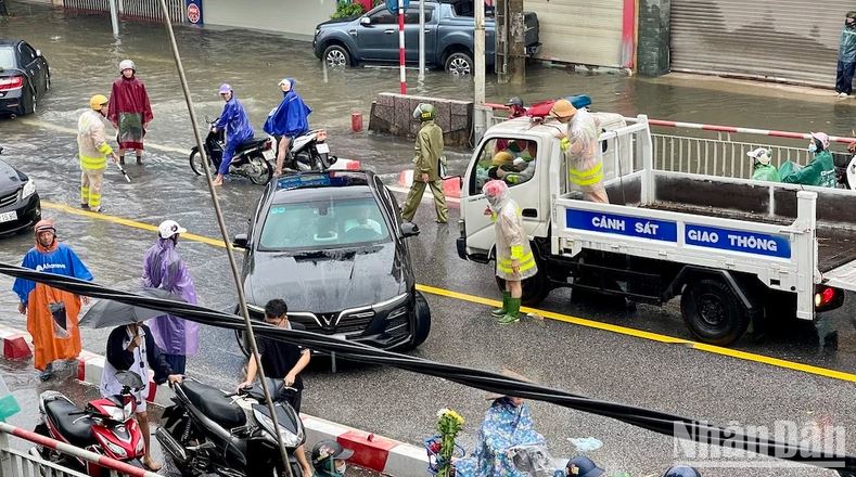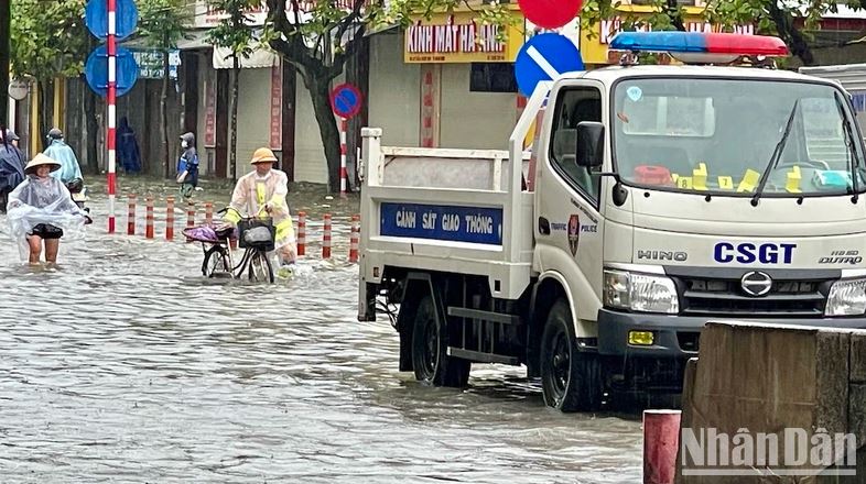 Từ 6 giờ sáng, hơn 40 cán bộ, chiến sĩ Đội Cảnh sát Giao thông - Trật tự Công an thành phố Nam Định đã được huy động làm nhiệm vụ tại các điểm ngập trên địa bàn.