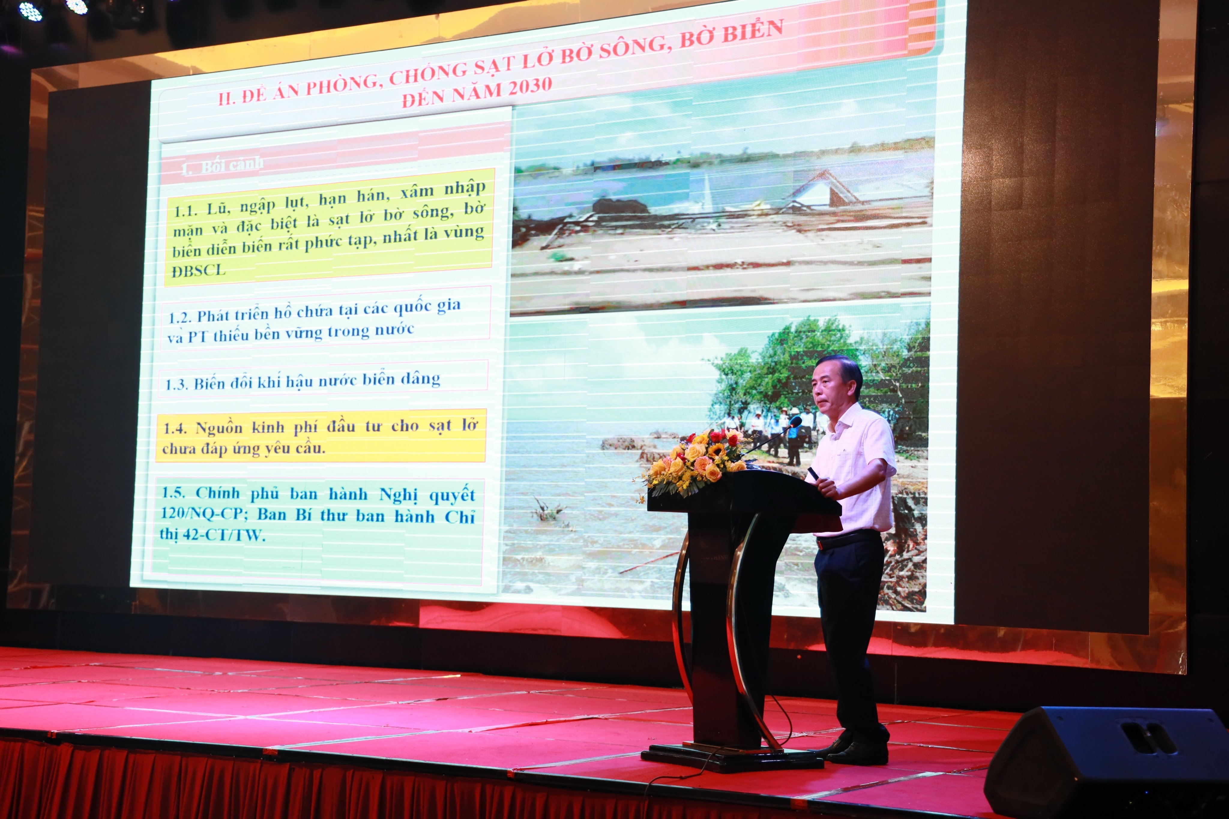 Ảnh: Ông Tăng Quốc Chính - Trưởng Phòng Kiểm soát an toàn thiên tai báo cáo tham luận "Thực trạng tình hình sạt lở bờ sông, bờ biển và giới thiệu Đề án phòng, chống sạt lở bờ sông, bờ biển đến năm 2030" tại Hội nghị.