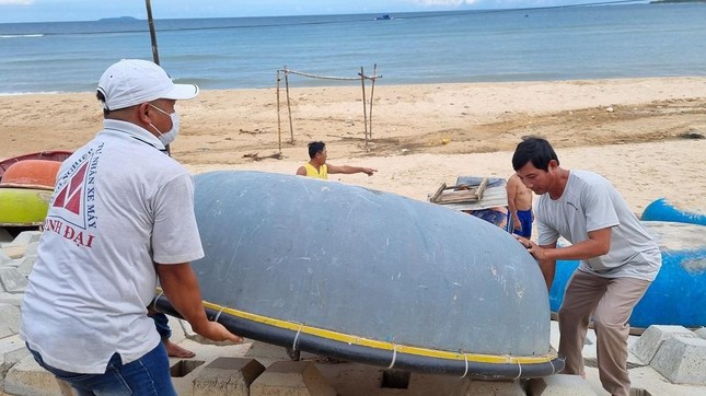 Nhiều ngư dân khiêng thúng, ngư lưới cụ lên bờ, lèn cột cẩn thận để bảo vệ tài sản trước khi bão vào Biển Đông.