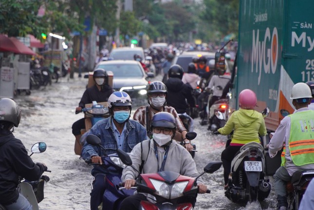 Tại đường Trần Xuân Soạn (quận 7), mực nước dâng cao làm hơn 500 mét đường bị ngập sâu.