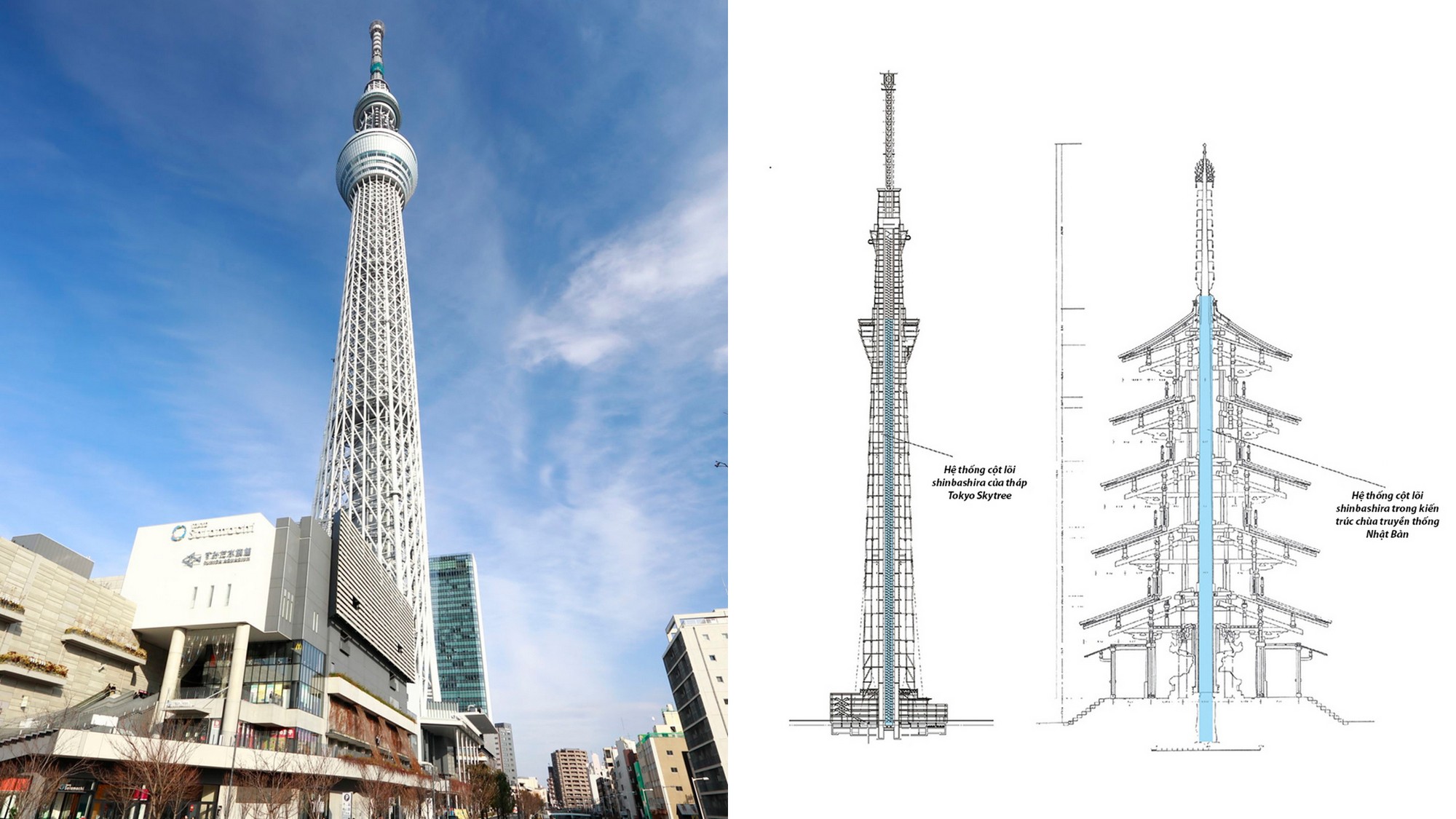 Với chiều cao 634m, tháp Tokyo Skytree (ảnh trái) áp dụng cấu trúc làm giảm rung lắc do động đất gây ra thông qua hệ thống kiểm soát rung động cột lõi (shinbashira), có chung các đặc điểm với cột lõi thẳng đứng shinbashira của kiến trúc chùa truyền thống Nhật Bản. (Nguồn: japan.go.jp)