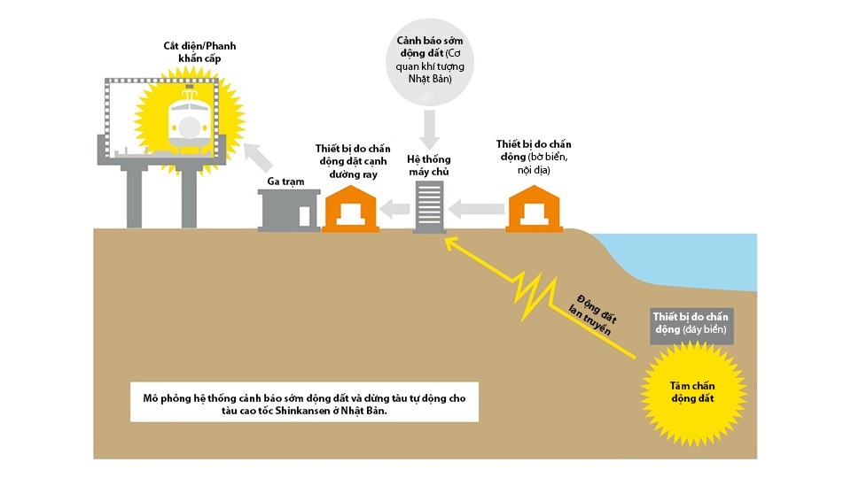 Mô phỏng hệ thống cảnh báo sớm động đất và dừng tàu tự động cho tàu cao tốc Shinkansen ở Nhật Bản. (Nguồn: japan.go.jp)
