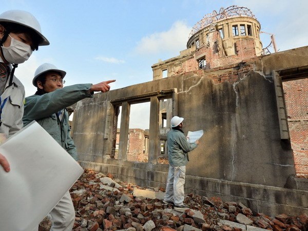 | Các quan chức đô thị kiểm tra Nhà vòm tưởng niệm các nạn nhân Bom Nguyên tử tại thành phố Hiroshima sau trận động đất sáng 14/3 |