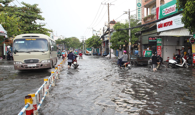 Lúc 14h chiều 3/5, mưa lớn đổ xuống một số quận như Gò Vấp, Bình Thạnh, Bình Tân, 12,... Nửa giờ sau, một số tuyến đường Nguyễn Văn Khối (Cây Trâm cũ), Lê Văn Thọ (quận Gò Vấp), Phan Văn Hớn, Nguyễn Văn Quá (quận 12),... bị ngập cục bộ.