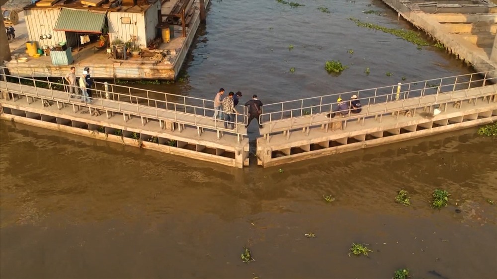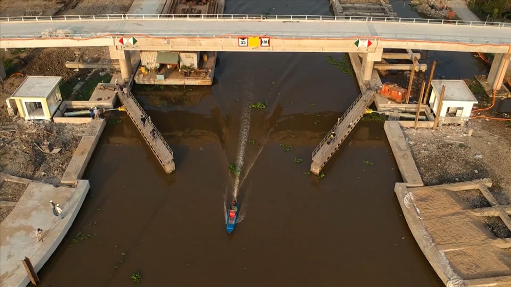 Cận cảnh cống Âu Thuyền Ninh Quới khi hoạt động.