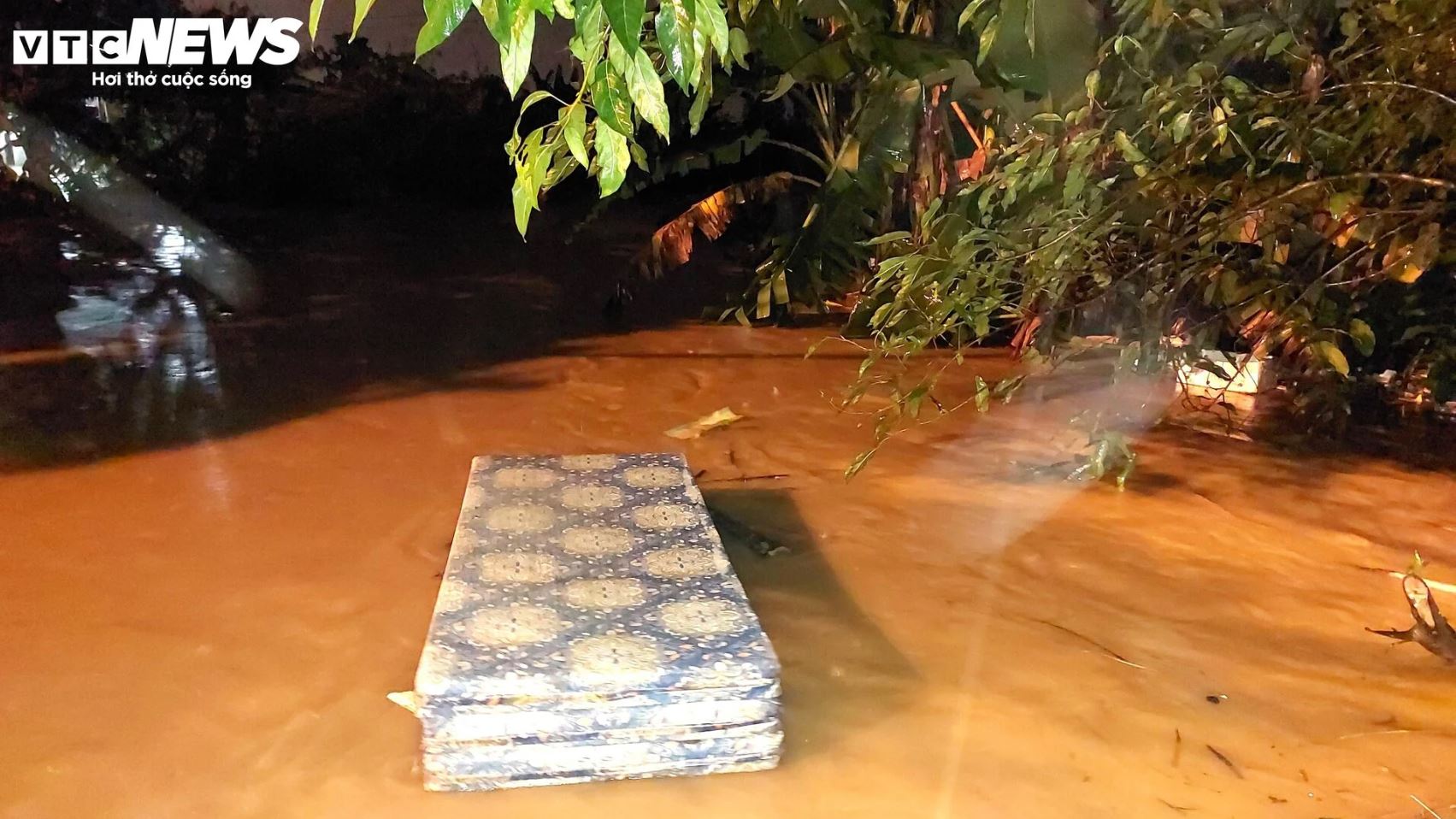Nước chảy xiết, cuốn theo cả tấm nệm của hộ dân ra kênh.