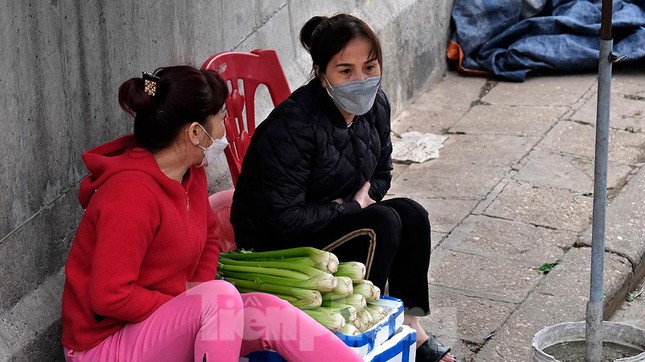 Những tiểu thương bán rau quả tại chợ Long Biên ngồi trú lạnh dưới ô. Người đạp xe thể dục trên đường Thanh Niên cũng mặc kín mít.