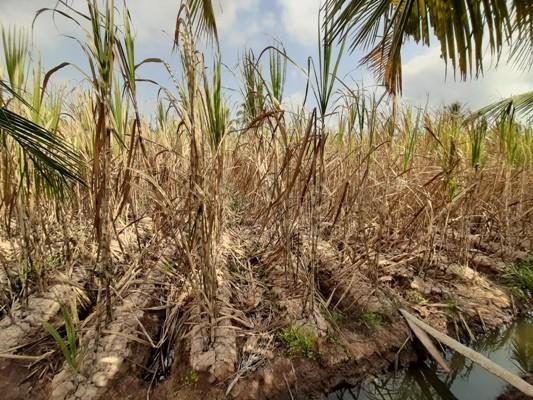 Ban ngày nắng chói chang, nóng hầm hập đến khô cả người. Nhiều kênh rạch không còn một giọt nước. Nếu nơi nào còn, thì lại toàn là nước mặn chát. Những cánh ruộng mênh mông trải dài chỉ có một màu vàng khô khốc. Những ruộng lúa dù có trổ bông nhưng không có hạt, chỉ để cho trâu bò ăn. Những ruộng mía bạt ngàn cũng xác xơ, trơ mình dưới cái nắng nóng như đổ lửa; thậm chí có nơi sau khi chặt, mía gốc còn lại chồi non cũng không ngoi lên nổi bởi vì mặn… Những đàn trâu bò chạy khắp nơi kiếm cỏ ăn nhưng làm gì còn cỏ khi ruộng bạt ngàn chỉ còn lại gốc rạ khô khốc ngắn ngủn dưới cái nắng chói chang… Những hình ảnh ghi nhận được: