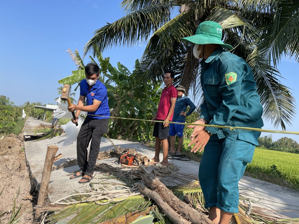 Lực lượng dân quân tự vệ, cán bộ xã, ấp, khóm đi sát đồng hành với người dân tiến hành các biện pháp giảm tải cho mặt đất, nhất là ở những tuyến đường có lòng sông khô cạn, nguy cơ sụt lún cao. Người cắt cây, tỉa cành, người làm rào chắn,… không khí diễn ra tất bật trên nhiều tuyến đường.