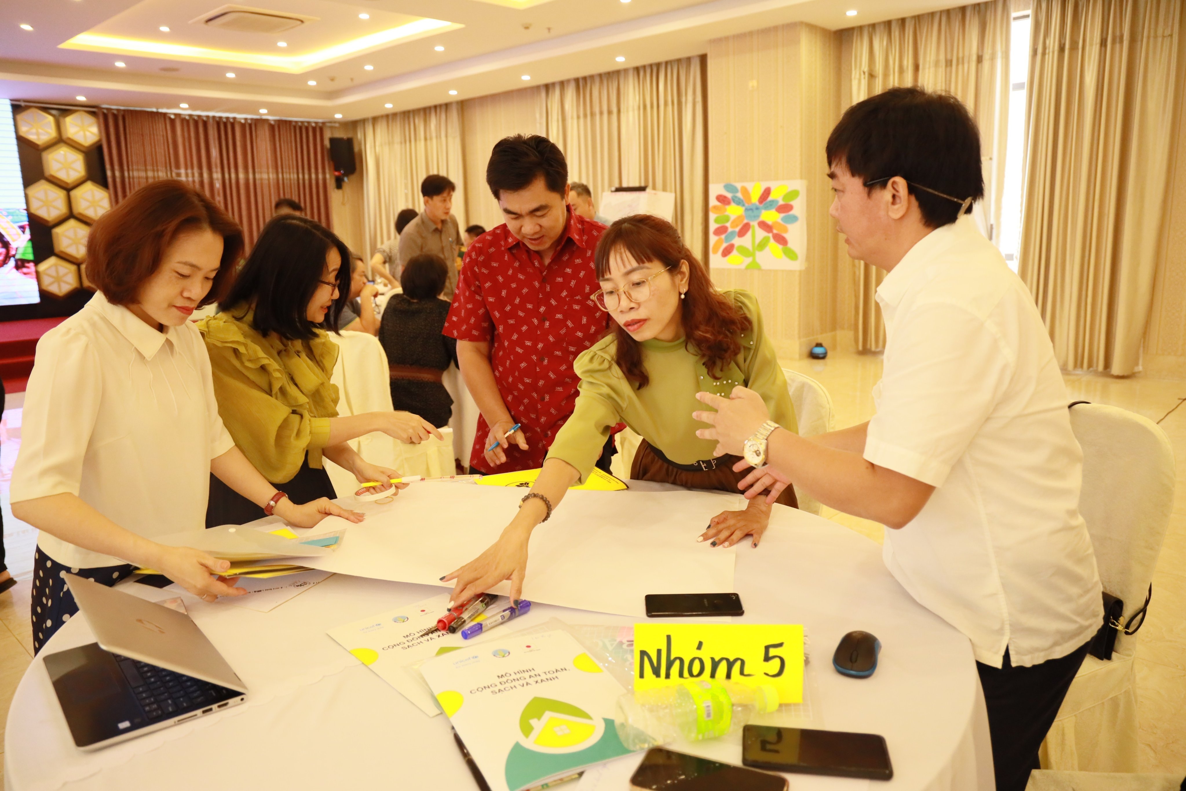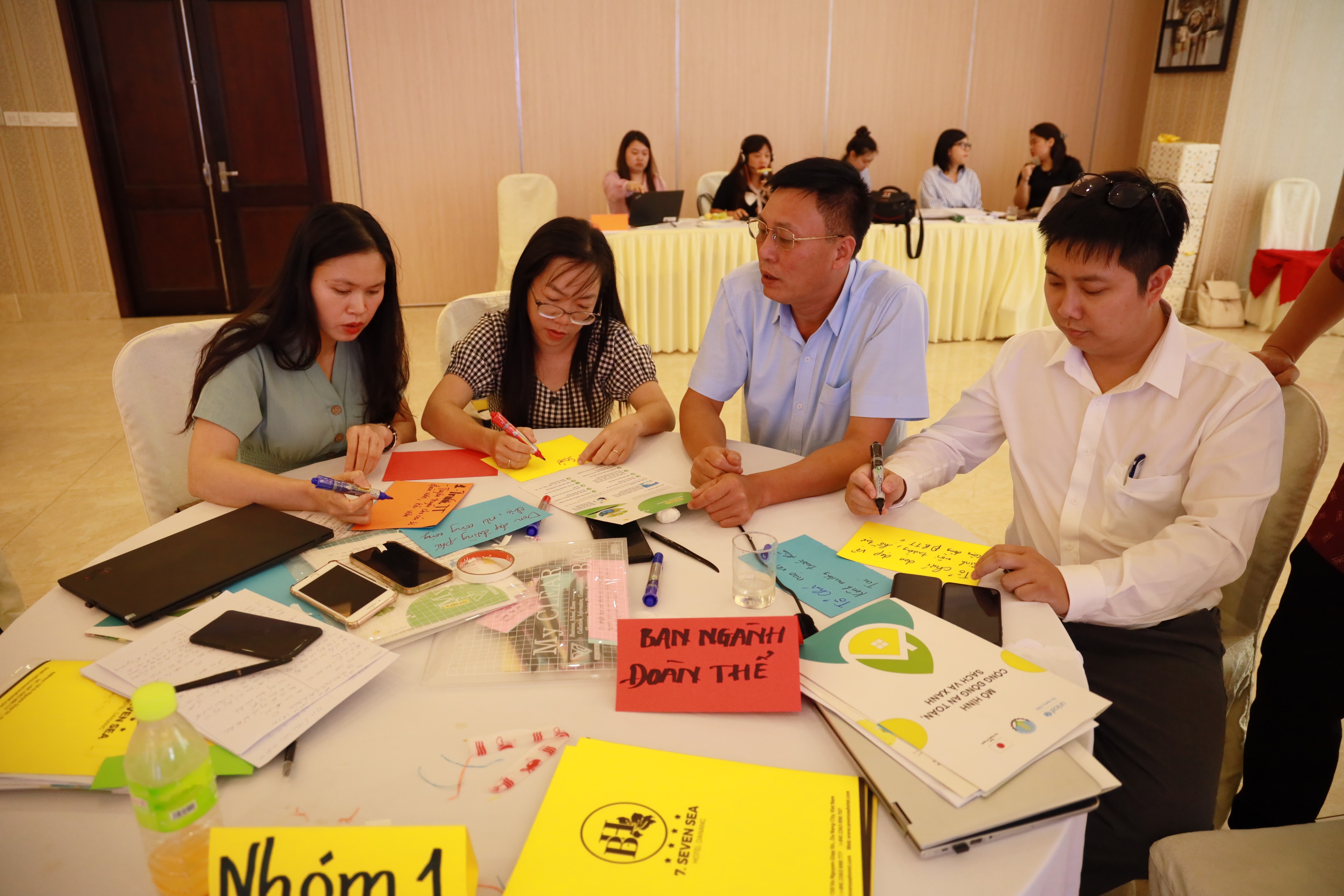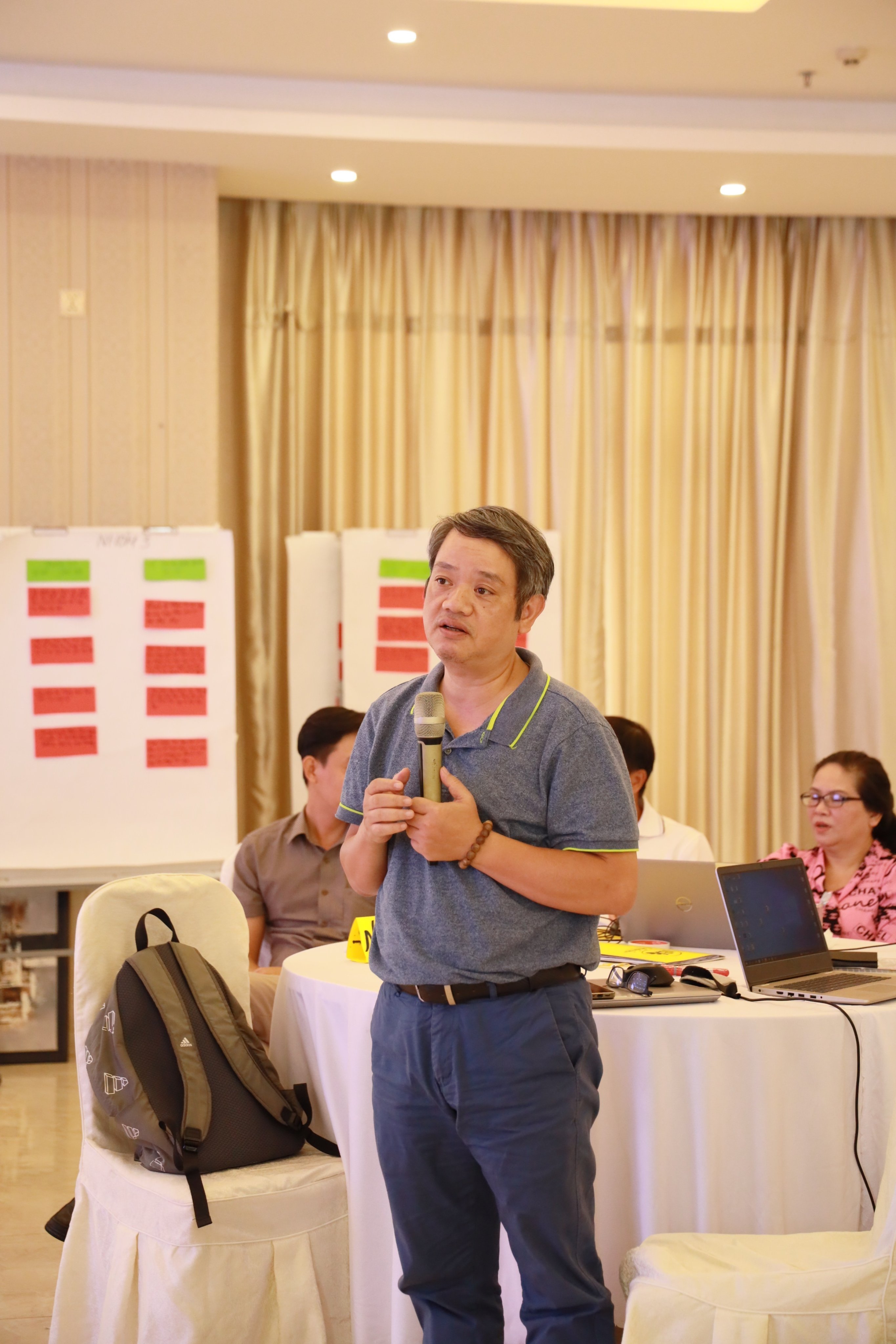 Tập huấn viên của Trung tâm góp ý Kế hoạch bài giảng và hướng dẫn Lập kế hoạch hành động cấp xã - Trụ cột 1 của mô hình cộng đồng an toàn sạch và xanh.