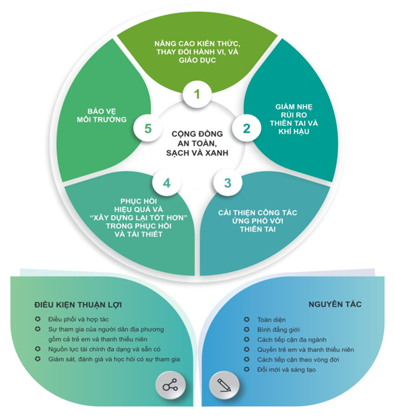 Với ý nghĩa đó, Cục Quản lý đê điều và Phòng, chống thiên tai đã phối hợp với UNICEF xây dựng bộ tài liệu Hướng dẫn thực hiện mô hình cộng đồng an toàn, sạch và xanh với sự tham gia nghiên cứu của các chuyên gia trong nước và quốc tế nhằm tổng hợp các bài học kinh nghiệm và mô hình trong công tác phòng chống thiên tai tại Việt Nam như chương trình Nâng cao nhận thức cộng đồng và Quản lý rủi ro thiên tai dựa vào cộng đồng, Chương trình mục tiêu quốc gia về Nông thôn mới của Chính phủ, đồng thời tham khảo kinh nghiệm từ UNICEF và nhiều quốc gia, trong đó có Nhật Bản, với mong muốn đưa ra nhiều giải pháp có hiệu quả, góp phần giảm thiểu rủi ro thiên tai tại Việt Nam.