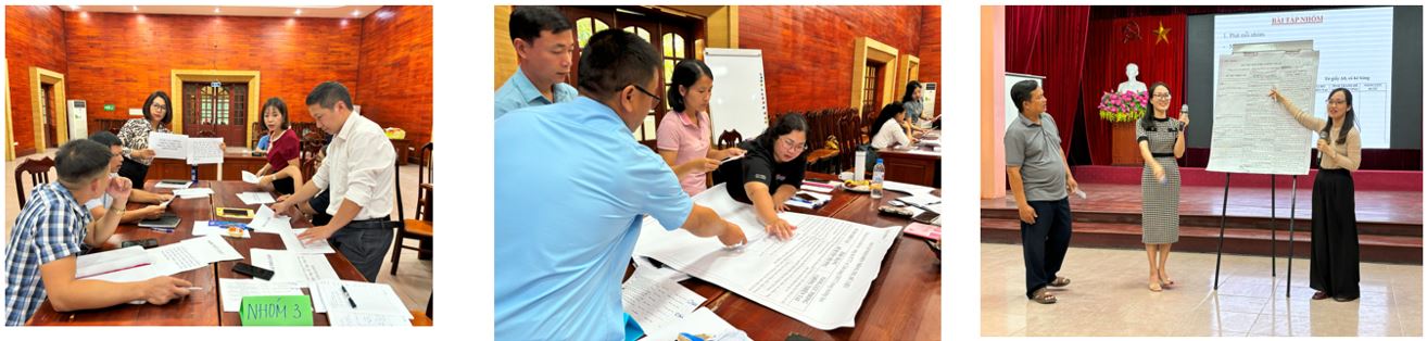 Các học viên làm bài tập và thảo luận nhóm nhỏ về các kiến thức cơ bản về QLRRTT trường học.
