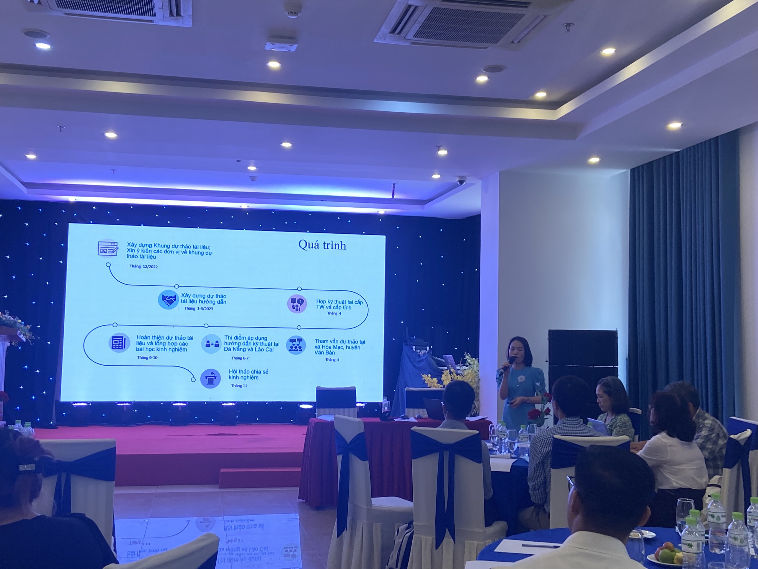 Bà Mai Thị Yến - Phó Trưởng phòng Đào tạo và bồi dưỡng nghiệp vụ, Trung tâm Chính sách và Kỹ thuật phòng chống thiên tai - trình bày nội dung chính của dự thảo Tài liệu hướng dẫn lồng ghép giới và phòng chống bạo lực trên cơ sở giới vào kế hoạch PCTT các cấp.