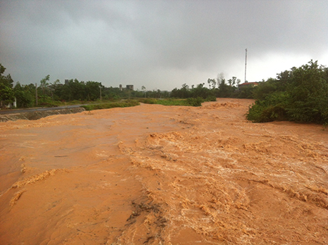 Nước từ đập xã Quảng Lợi ùn ùn đổ về khu vực Thị trấn Đầm Hà.