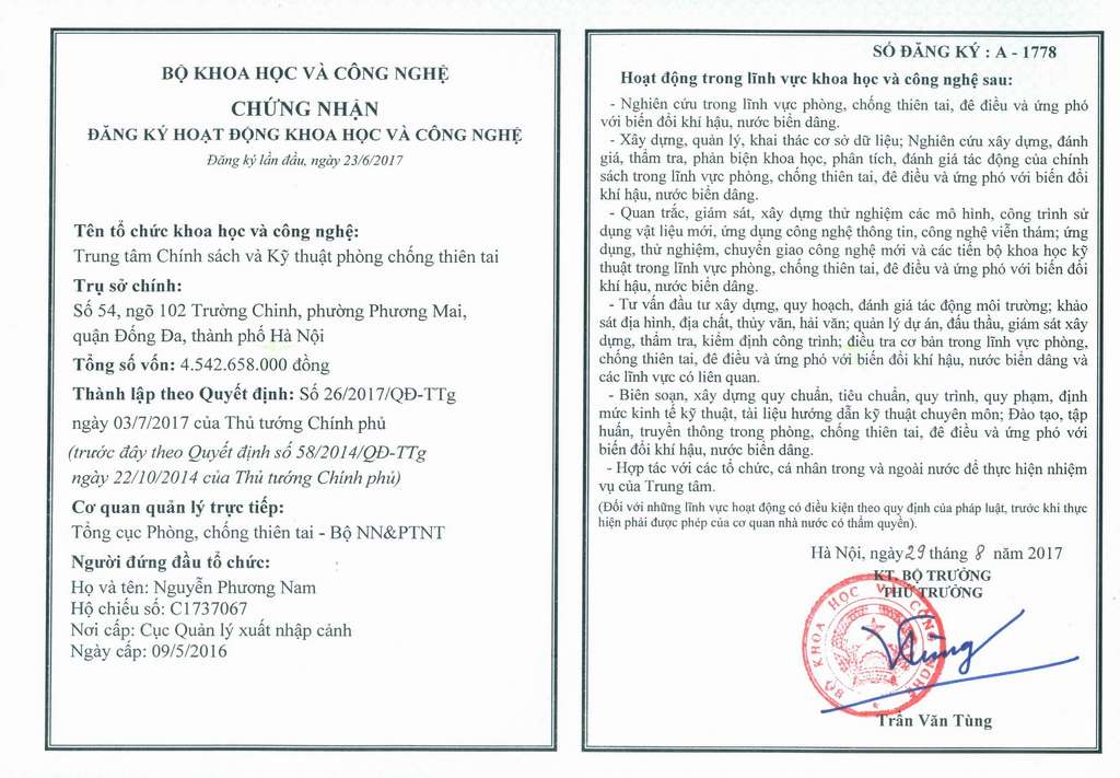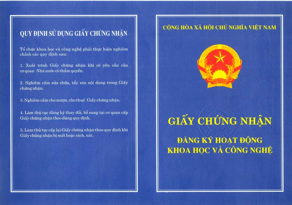 Chứng nhận đăng ký hoạt động khoa học và công nghệ do Bộ Khoa học công nghệ cấp số A-1778 ngày 29/8/2017.