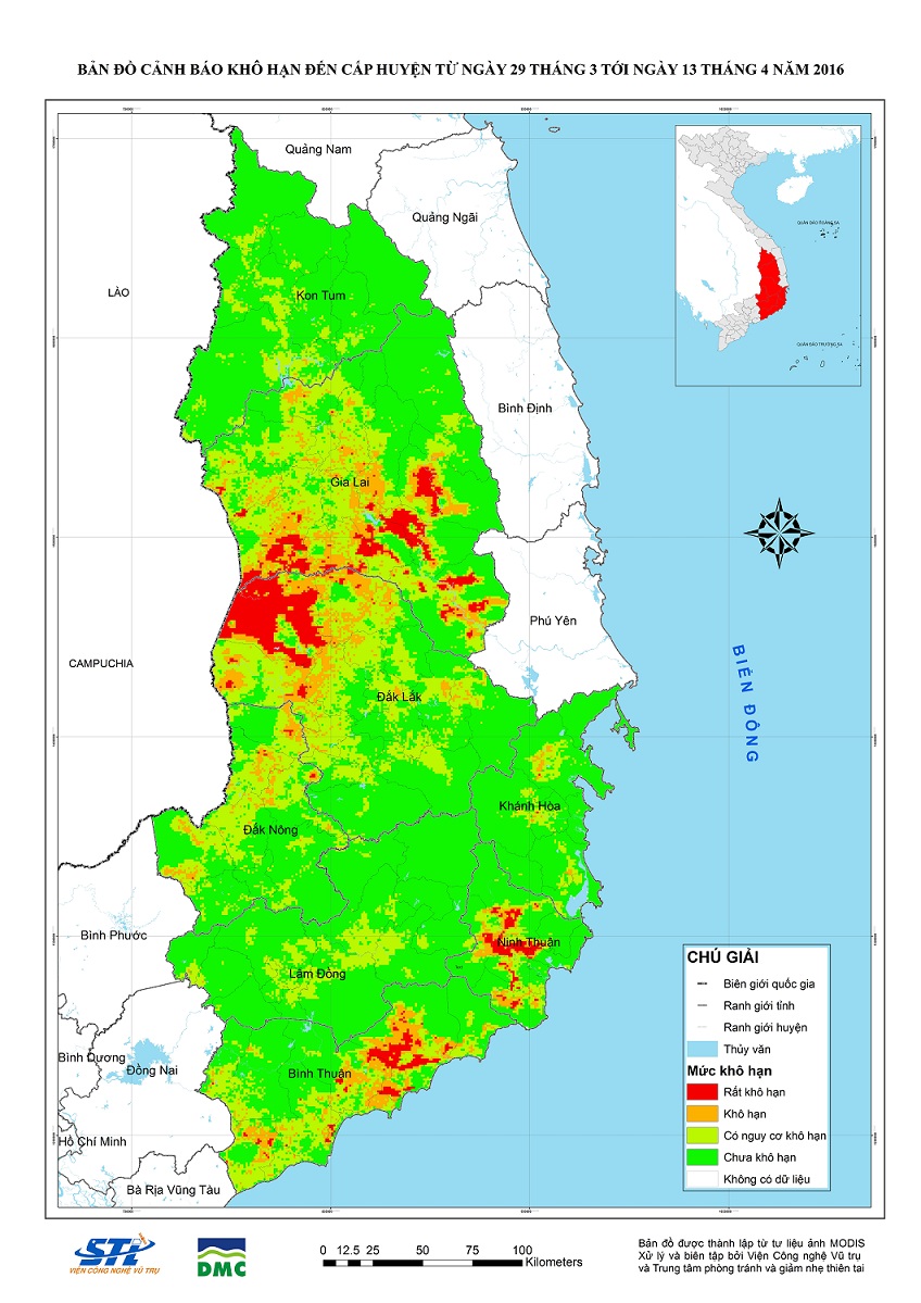 Trung tâm Phòng tránh và Giảm nhẹ thiên tai đã phối hợp với Viện Công nghệ vũ trụ (STI-VAST) tiếp nối triển khai thu thập ảnh vệ tinh quang học và xử lý ảnh, thành lập bản đồ khô hạn giai đoạn tiếp nối từ 29/3 đến 22/4/2016 cho khu vực tương tự nêu trên.