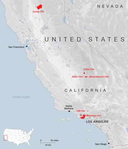 Thứ 7, ngày 10 tháng 11: Con số thương vong vì các vụ cháy rừng thảm khốc: Cam Fire, Woolseyy Fire và Hill Fire đã tăng lên 25. Trong 3 ngày qua, những đám cháy lớn ở Bắc và Nam Califronia đã thiêu rụi hàng nghìn công trình và khiến hơn 300.000 người sơ tán vì mất nhà cửa. Giới chức địa phương ước tính cứ mỗi 3 giây thì đám cháy lại thiêu rụi một vùng có diện tích bằng cả sân bóng bầu dục (gần 17 ha).