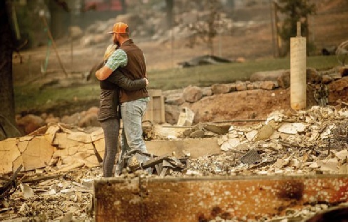 Cặp vợ chồng ôm nhau trong sự sợ hãi, xung quanh họ là ngôi nhà đã bị thiêu rụi hoàn toàn. (Nguồn: Internet)