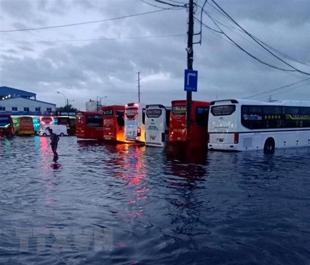Nước ngập tràn vào Bãi đỗ Xe khách tại Bến xe Miền Tây, quận Bình Tân. (Ảnh: Hồng Giang/TTXVN)