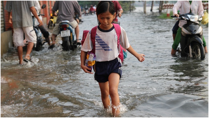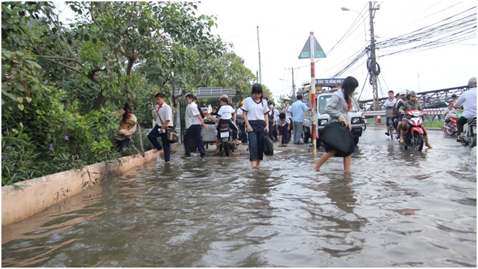 Do triều cường lên vào sáng sớm nên việc đi lại của học sinh và công nhân gặp khó khăn, nhiều học sinh phải lội bì bõm đến trường. Một số em phải nghỉ học do bị té và bùn bắn vào người. Nhiều phụ huynh phải lội nước bế trẻ đến lớp.